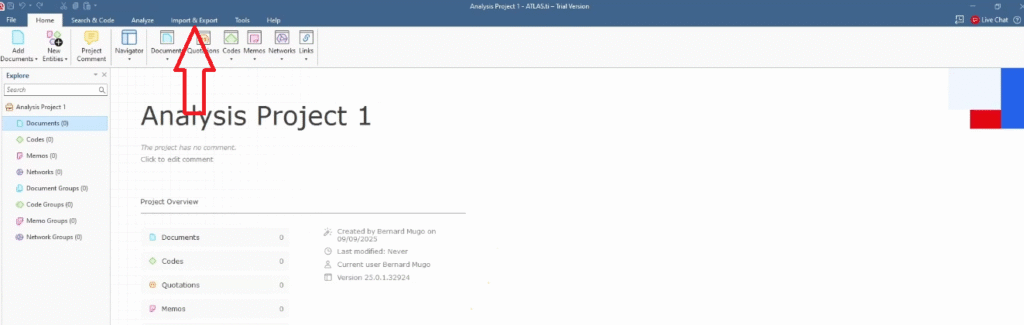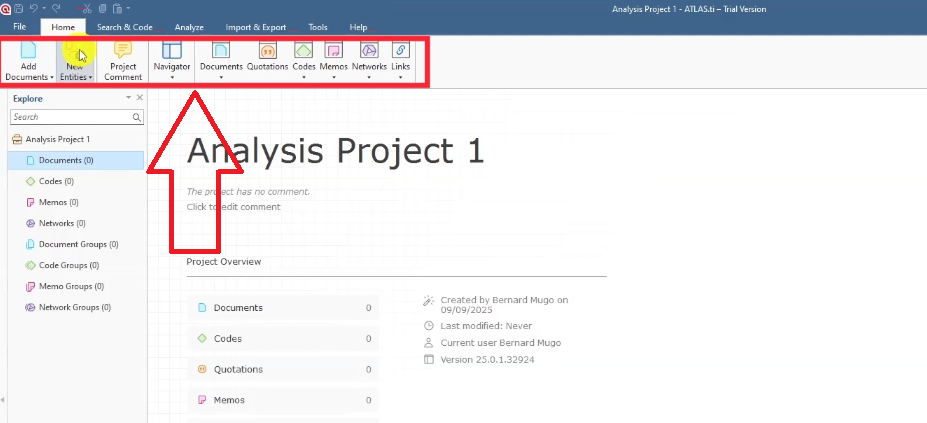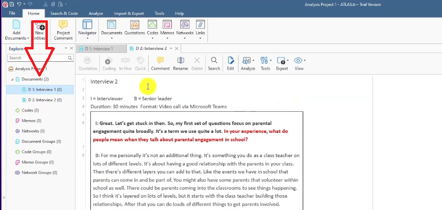 We have a secondary menu that is made up of documents, new entities, project comment, navigator, documents, quotations, codes, memos, networks, and links.