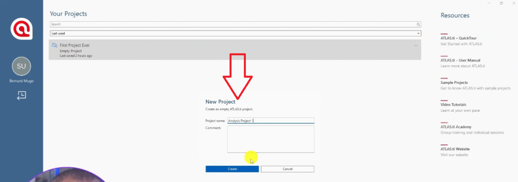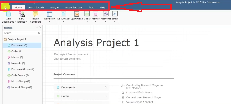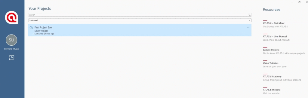 The first thing we see when we open Atlas. ti is the blue menu and other menus on the left.