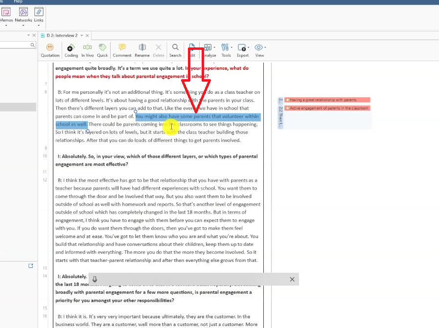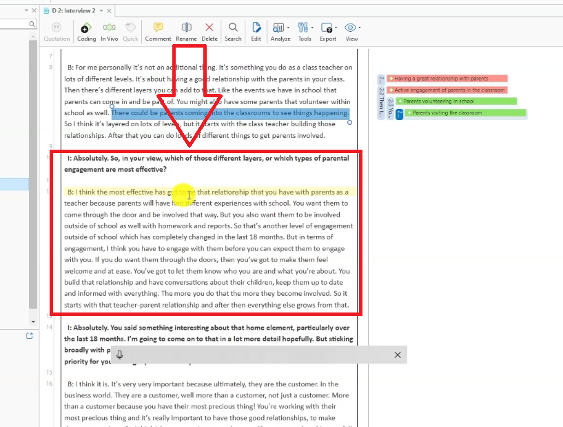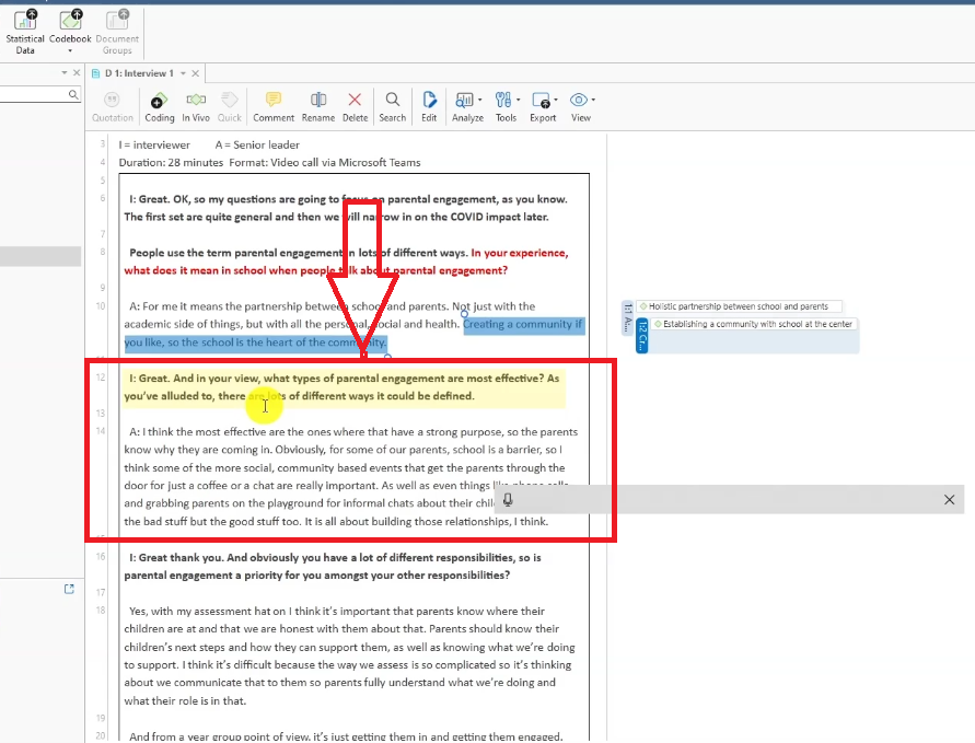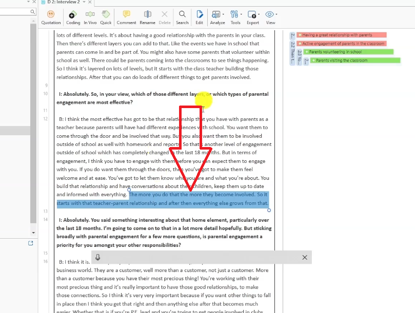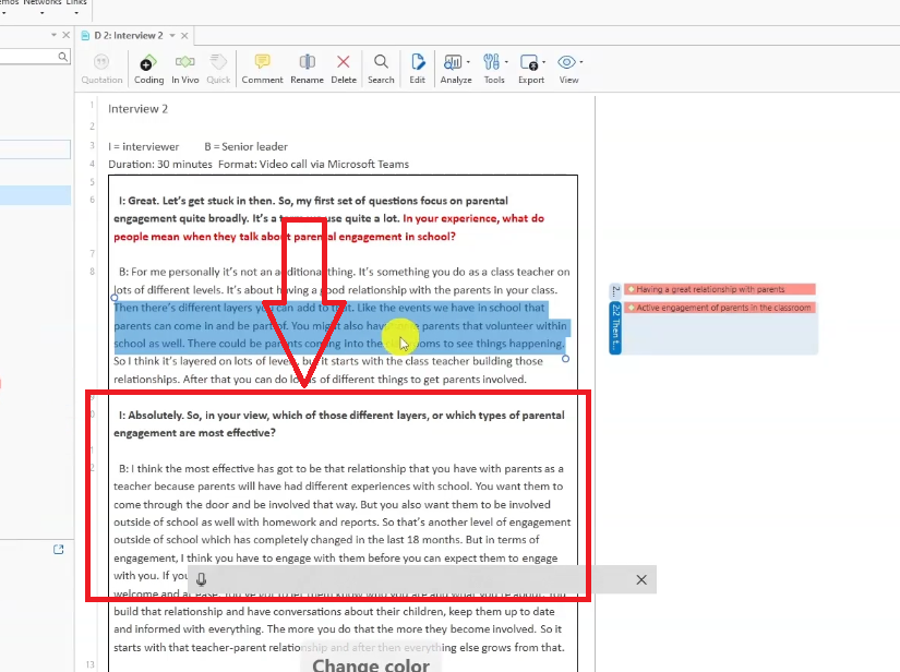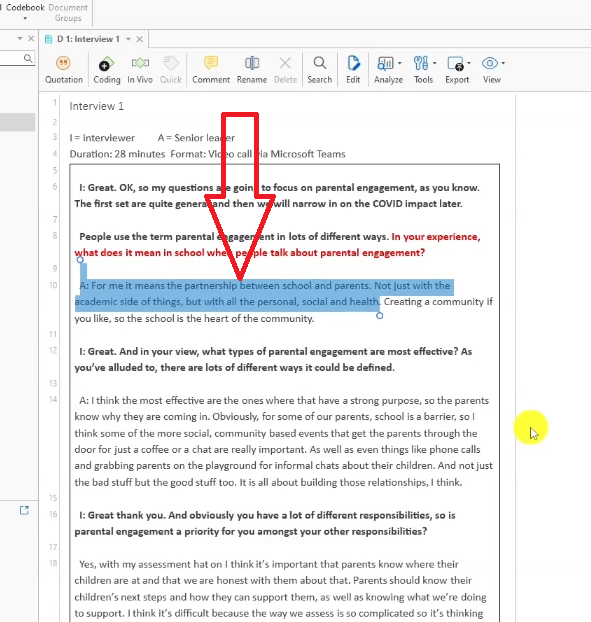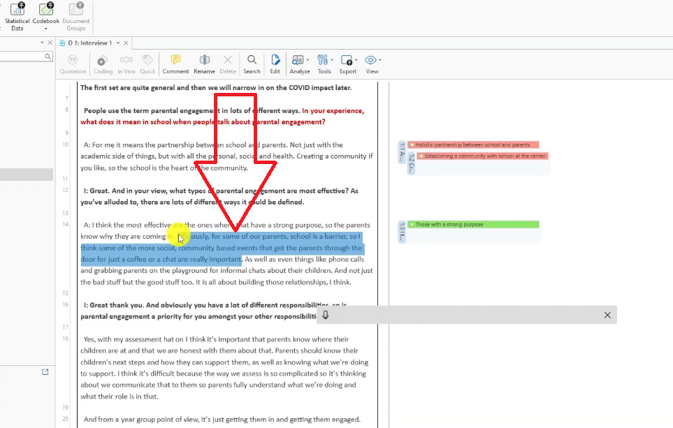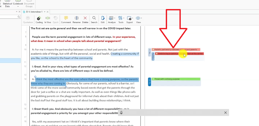 Now I want to go and do another batch of codes for the second interview and then we are going to see how we combine these codes to form themes.