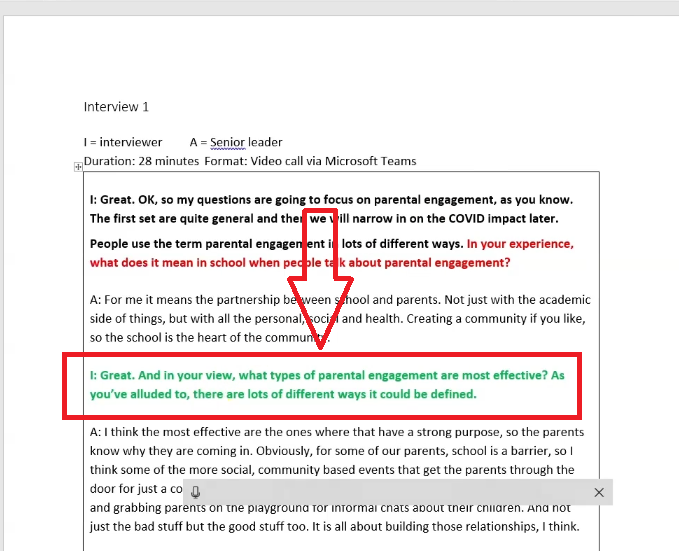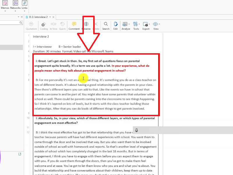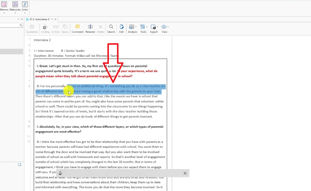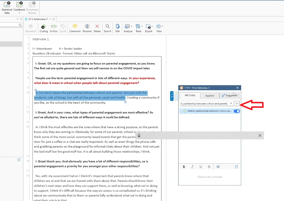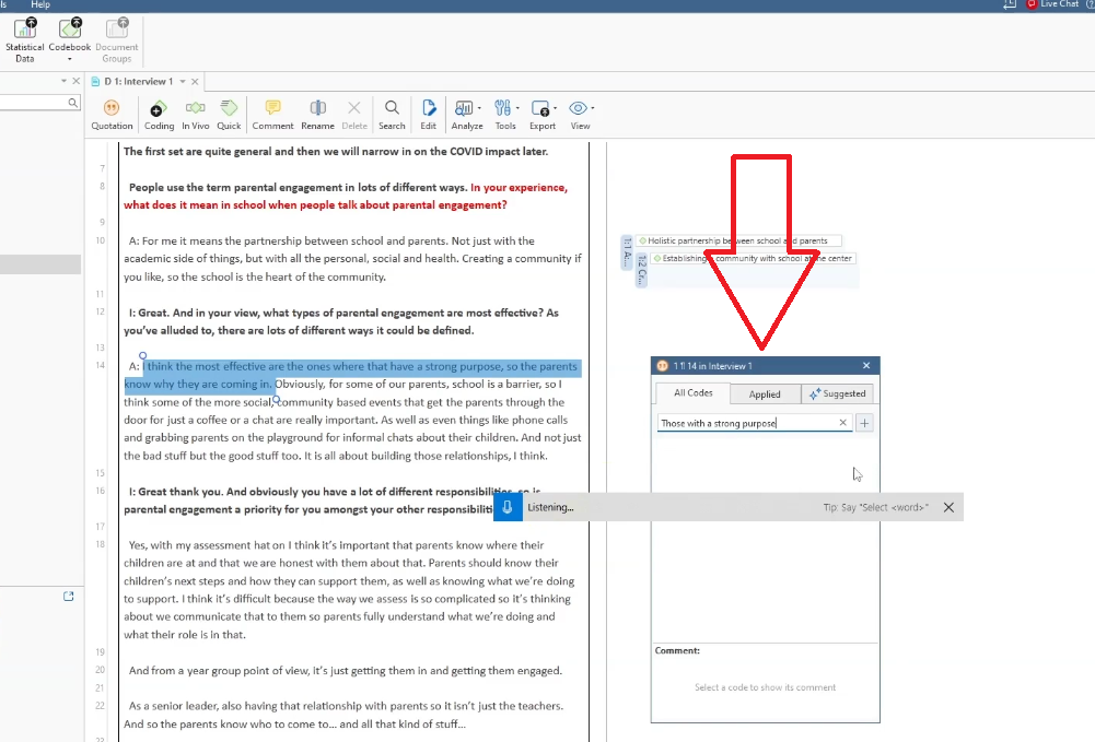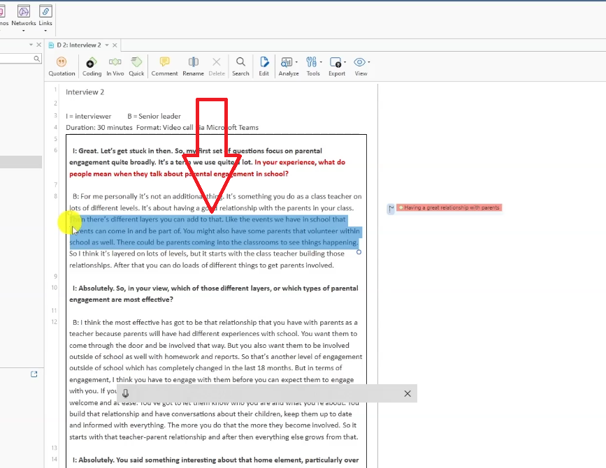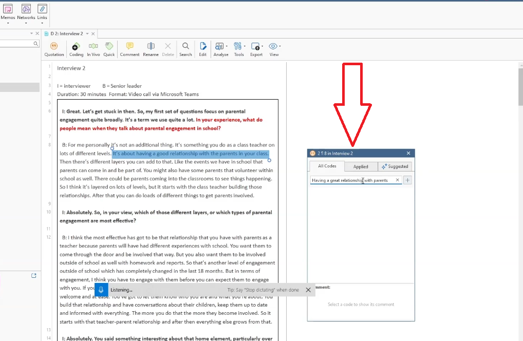 Now I want to go and do another batch of codes for the second interview and then we are going to see how we combine these codes to form themes.