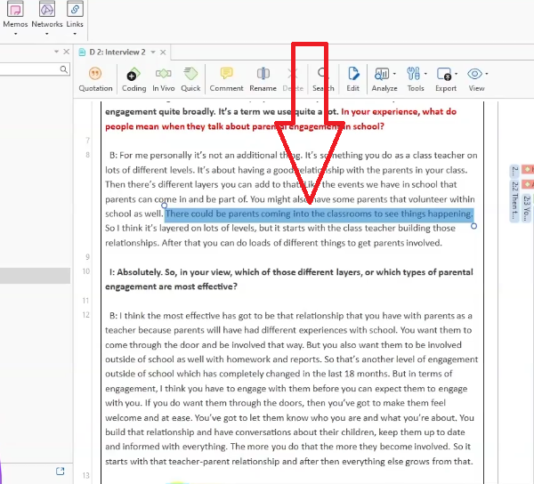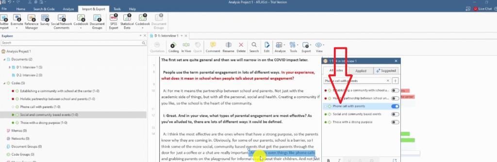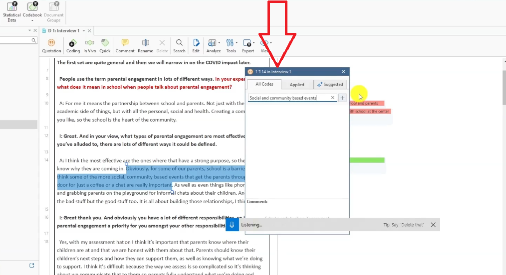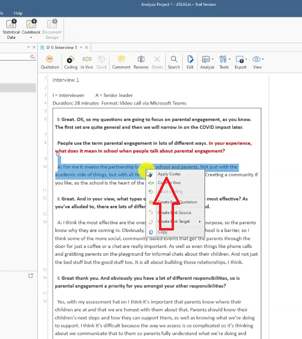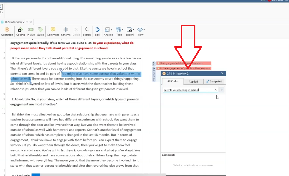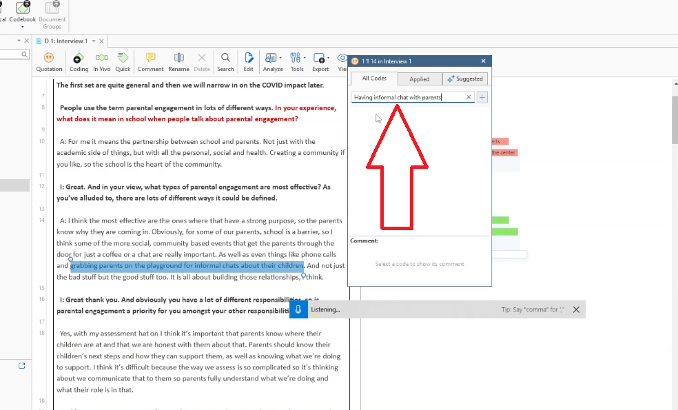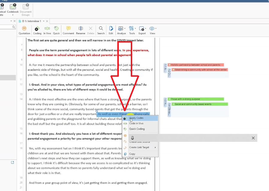 This one also, I right click, I go to apply codes and then I state, having informal chats with parents.