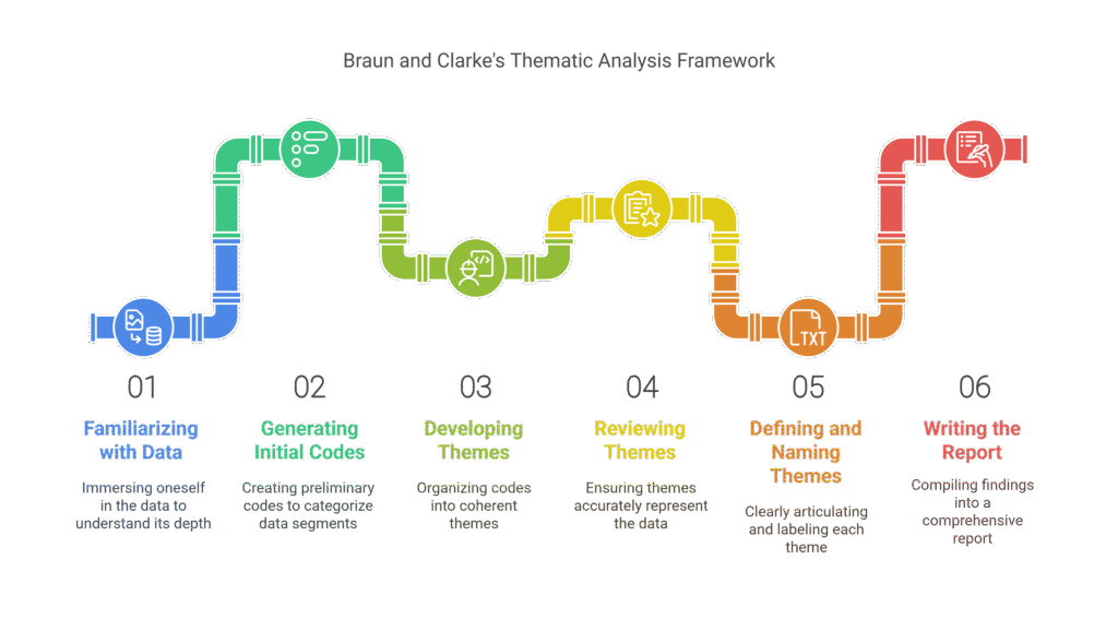 For example for this article I’m going to conduct thematic analysis on the interviews using the Braun and Clarke six-step framework of conducting thematic analysis which includes familiarizing with the data, generating initial codes, developing themes, reviewing themes, defining and naming themes and writing the report.
