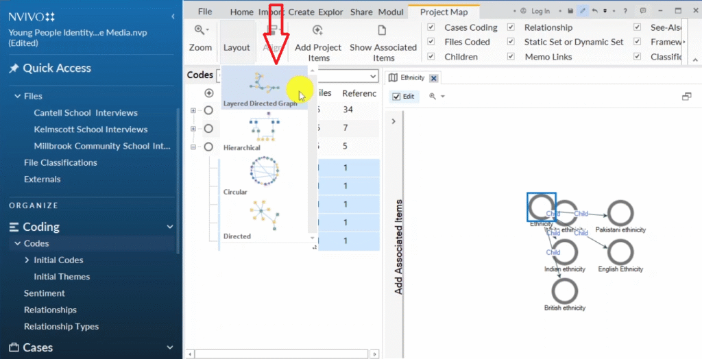If you click on the diagram and go to this area where you see the layout, you can see the different layouts that NVivo 14 gives us.