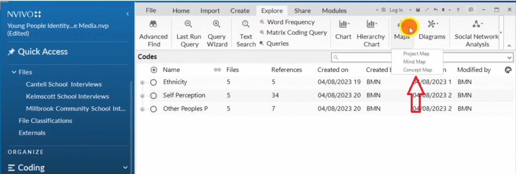 If we click on explore and go to maps and go to concept map, I would just want to represent the connection between the different themes using a concept map.
